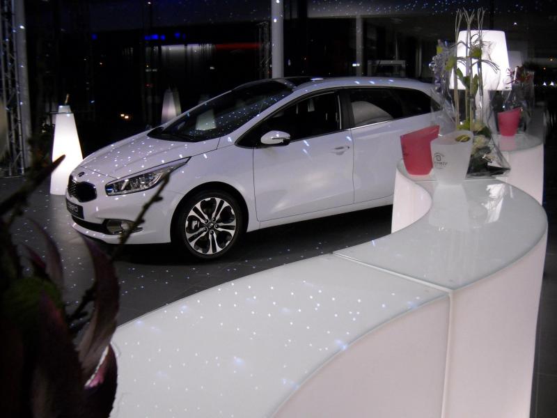 Mise en place d'un espace de réception se composent de mobilier rétro éclairé pour l'inauguration du garage KIA.
