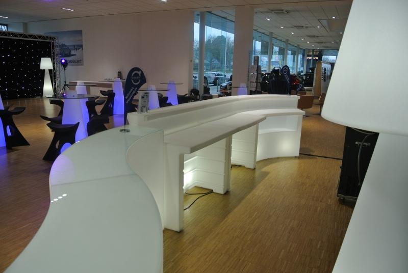 Aménagement en mobilier, bar modulable avec structure de fond en pendrillon LEDs.